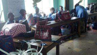 Auf dem Foto sind 15 AFB-Mitglieder bei der Schulung zum Flechten von Körben zu sehen. Die Arbeit dient dem Zweck der Schaffung von Arbeitsplätzen und der Bekämpfung des Gebrauchs von umweltschädlichen Plastiktüten.